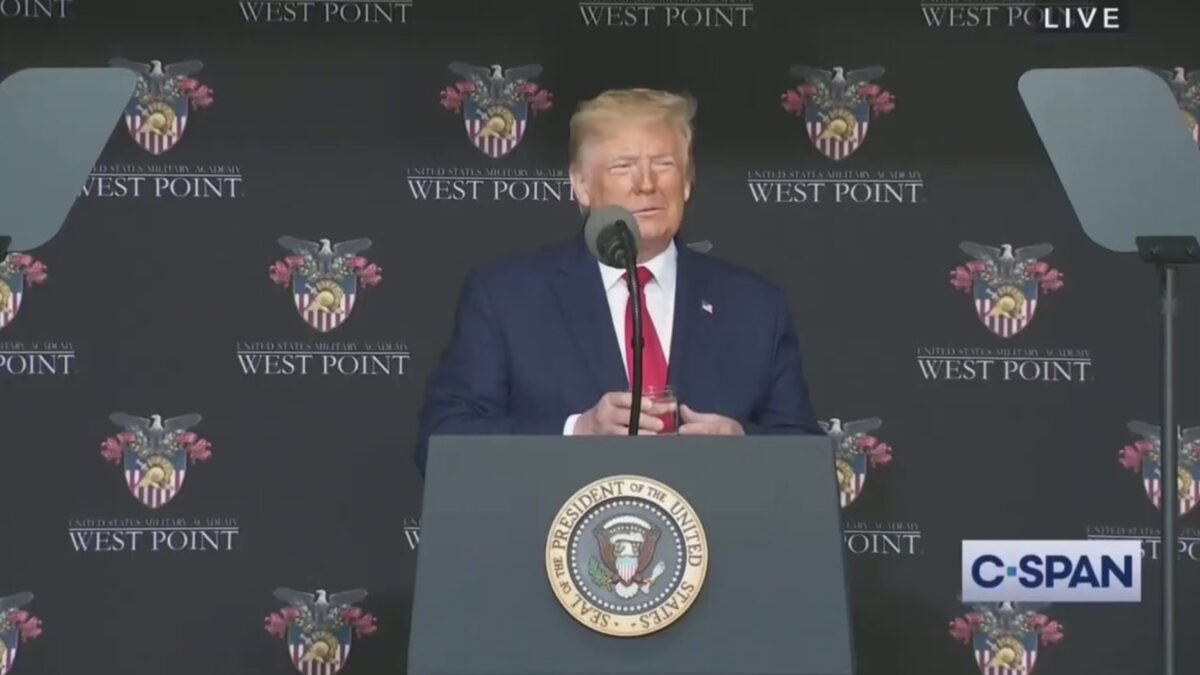 Het gaat nu even om een aantal opvallende waarnemingen die gedaan werden tijdens zijn speech op de militaire academie van West Point (New York). Op z'n minst opvallend was het moment dat hij een slok wil nemen van zijn water. Lijkt niet geheel soepel te verlopen. Daarna een momentje op de trap, zelfde verhaal.