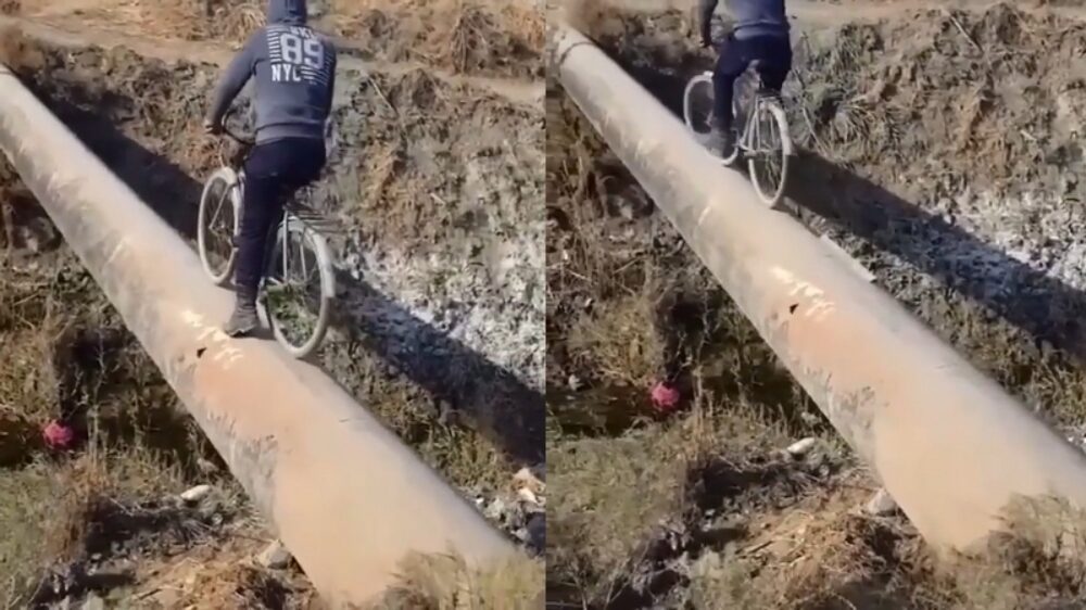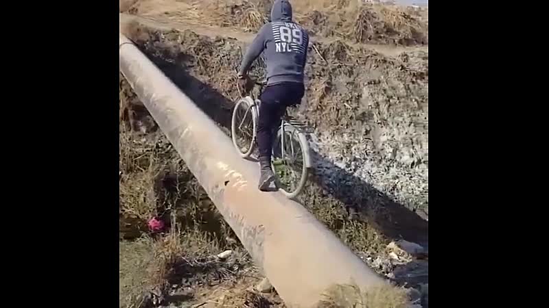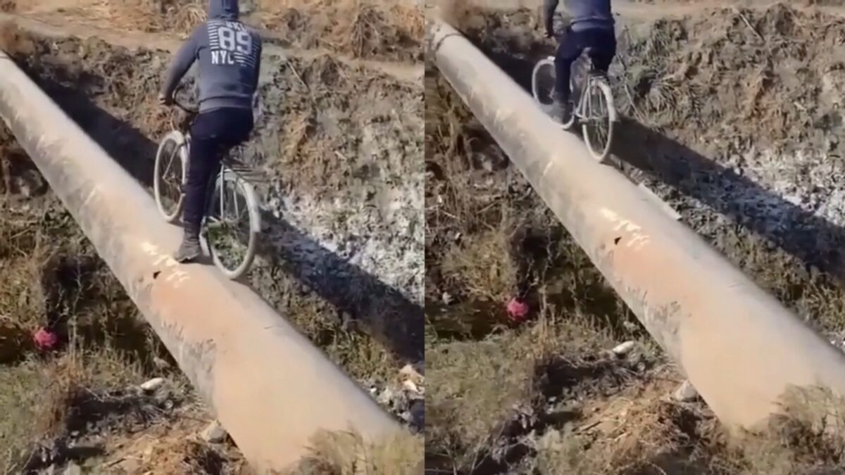 Onnozele gaat uitdaging aan om over een stalen buis te fietsen