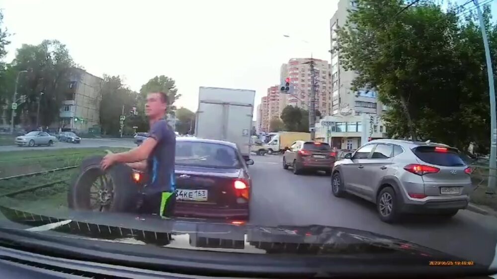 Als je een wiel met een noodgang op je auto af ziet komen rollen, wat doe je dan? Waarschijnlijk niks, want tegen de tijd dat je beseft wat er aan de hand is heeft dat ding je voorruit al verbrijzeld, maar deze held was precies op tijd.