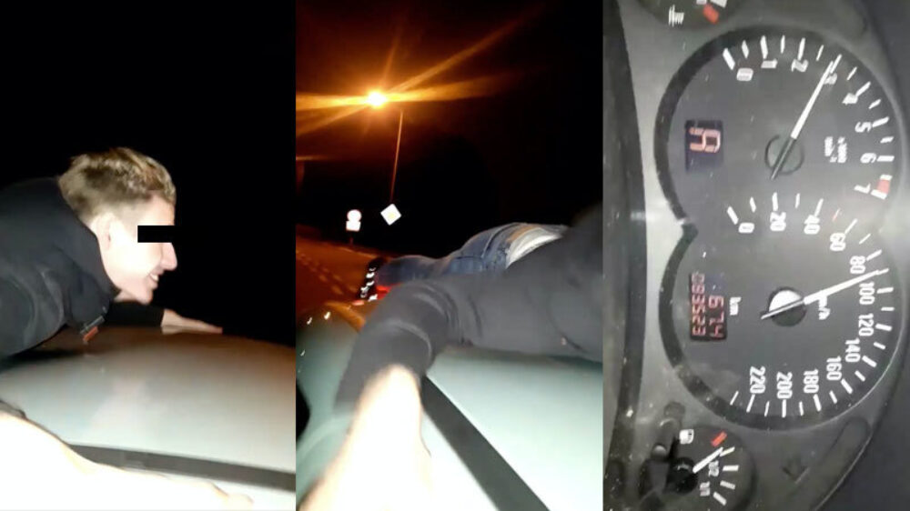 Gisteravond in Abbenbroek: stuntpiloot ligt op auto die 100 km/u rijdt