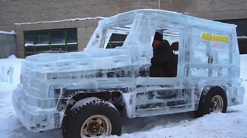 Russische automonteurs hebben een blyatmobiel gemaakt die uit ijs bestaat
