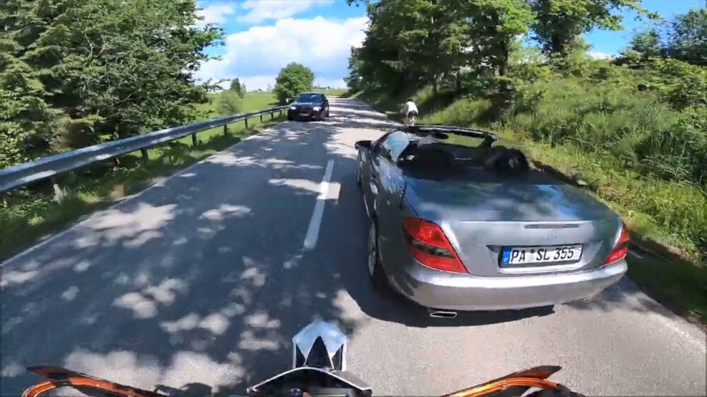 Ze zeggen dat degene die achterop knalt altijd fout is, maar echt lekker foutloosv is deze KTM-motorrijder nou ook niet bepaald.