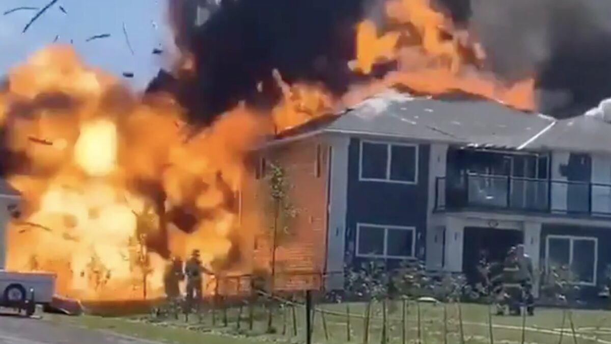 Enorme propaantank explodeert terwijl brandweermannen het huis blussen
