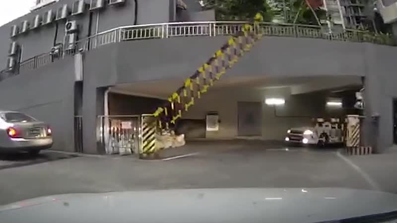 Aziatische vrouw zet haar auto in de achteruit en rijdt zichzelf ondersteboven Fails