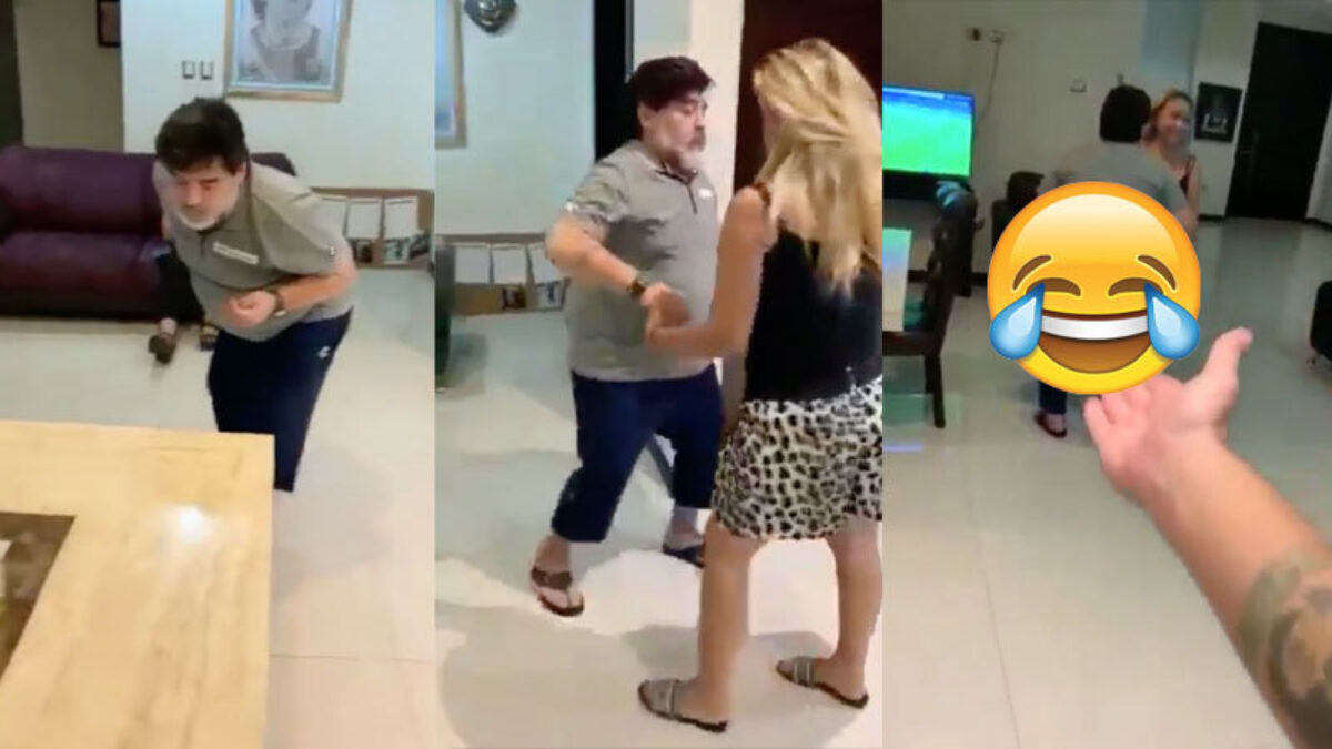 Maradona gaat helemaal op in het dansen en laat zijn broek zakken