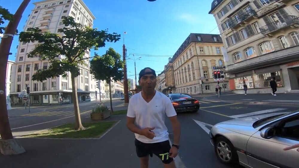 Een Zwitserse motorrijder ziet hoe een agressief mannetje tegen een autodeur aan het trappen is terwijl er nog een bejaarde man tussen staat. De held zonder cape (maar wel in het leer) wacht niet af en grijpt gelijk in.