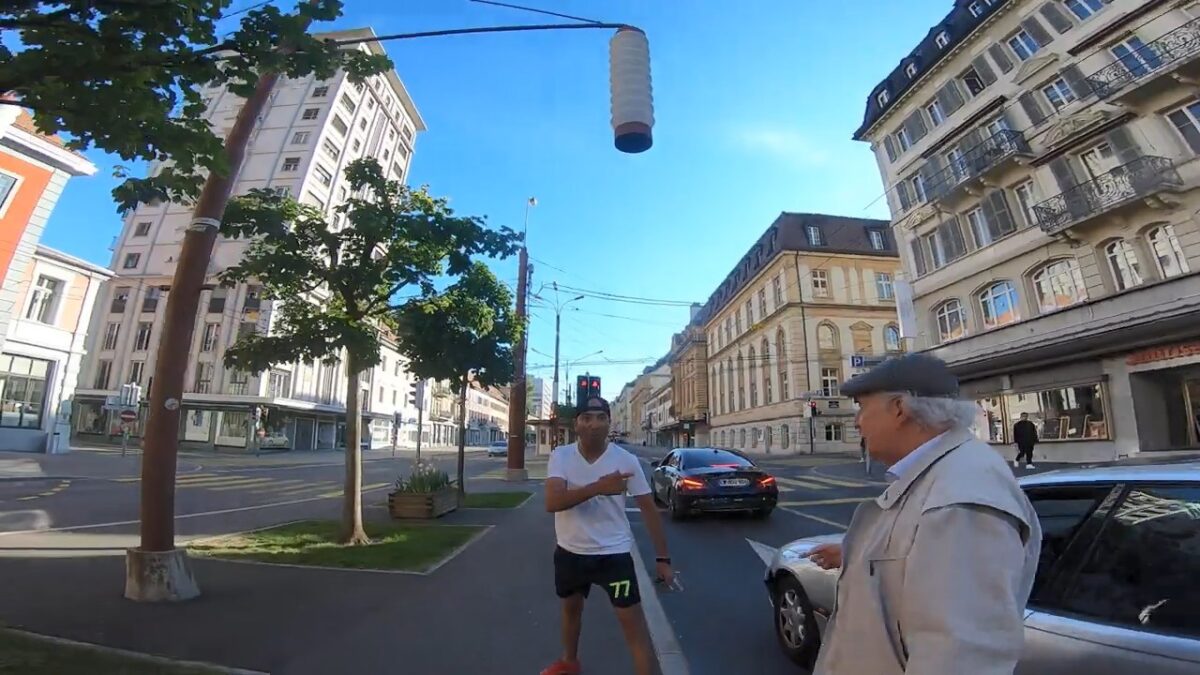 Een Zwitserse motorrijder ziet hoe een agressief mannetje tegen een autodeur aan het trappen is terwijl er nog een bejaarde man tussen staat. De held zonder cape (maar wel in het leer) wacht niet af en grijpt gelijk in.