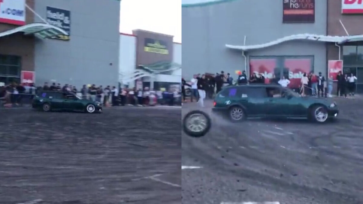 Kleine protip voor als je dikke donuts wil draaien met je auto: zorg dat alles goed vastzit. Voordat je het gaan onderdelen er vandoor, zoals in dit geval het achterwiel.