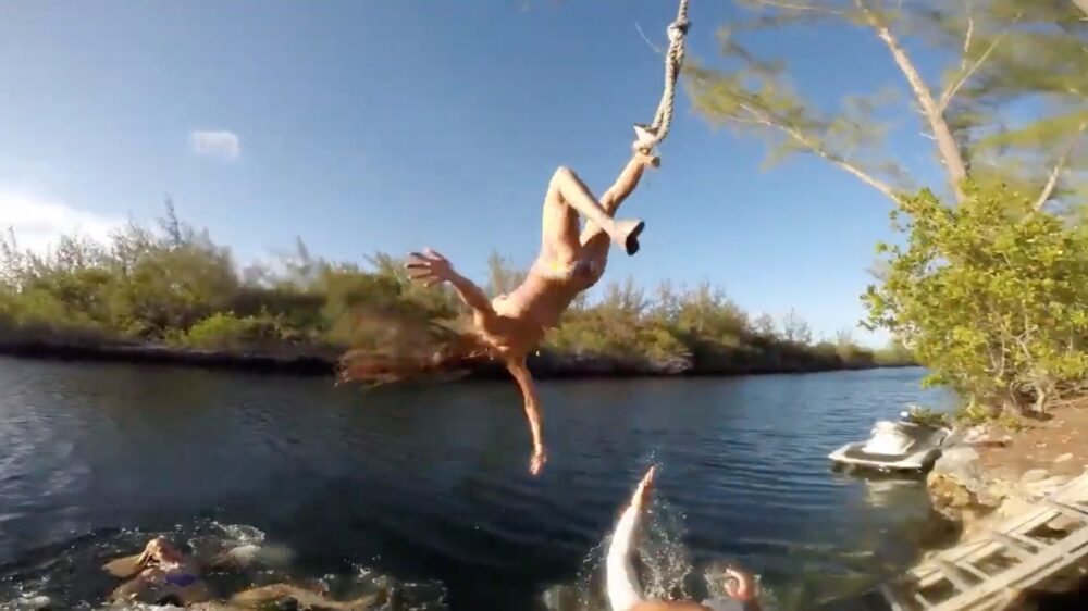 Jane maakt een behoorlijke klapper als ze sierlijk tegen de rotsen slingert