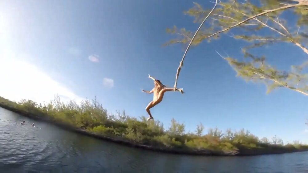 Jane maakt een behoorlijke klapper als ze sierlijk tegen de rotsen slingert