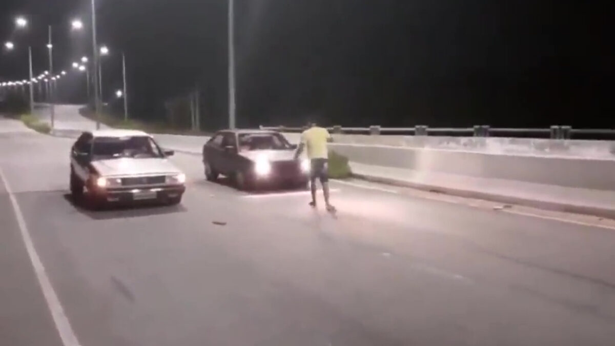Protip voor als je nog eens een straatrace moet starten: blijf nog even wachten tot de auto's weg zijn en maak je dán uit de voeten. Die memo had deze faalhaas nog even niet gehad.