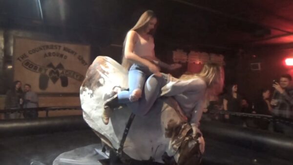 Rodeomeiden worden flink door elkaar geschud op een mechanische stier
