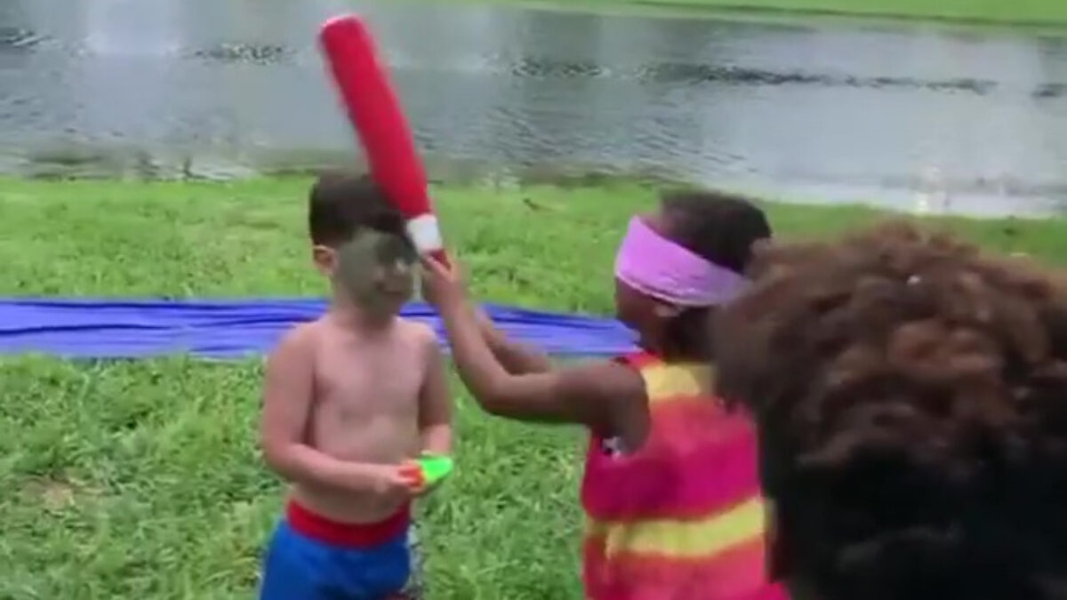 Jongedame met knuppel heeft de verkeerde piñata te pakken Fails