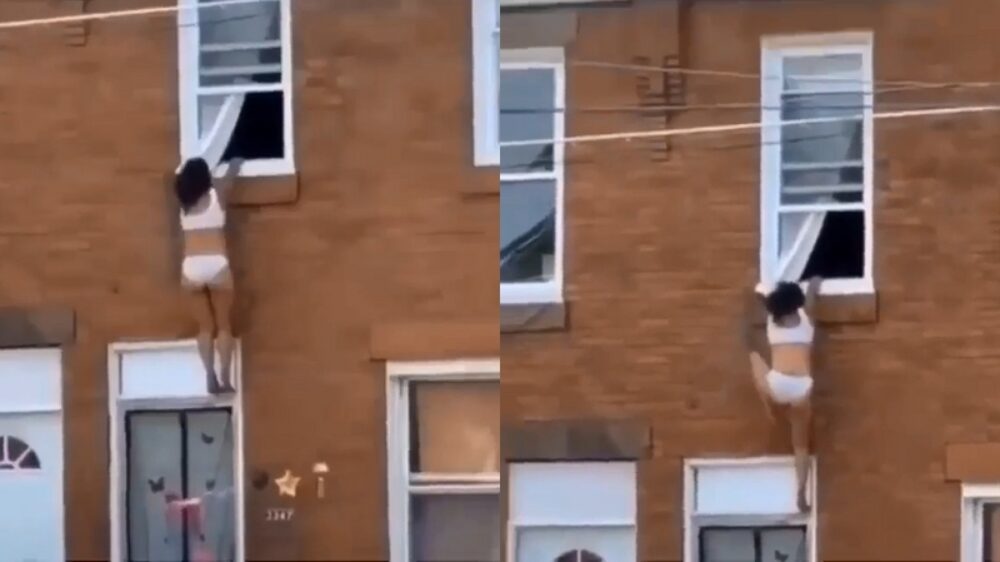 Altijd vervelend als de vrouw van je scharrel eerder thuiskomt dan verwacht, maar misschien is het handiger om de volgende keer toch een andere ontsnappingsroute te bedenken?