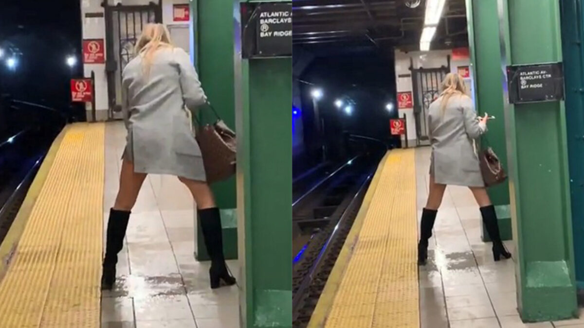 Dronken chick met hoge nood laat alles lekker lopen op het perron