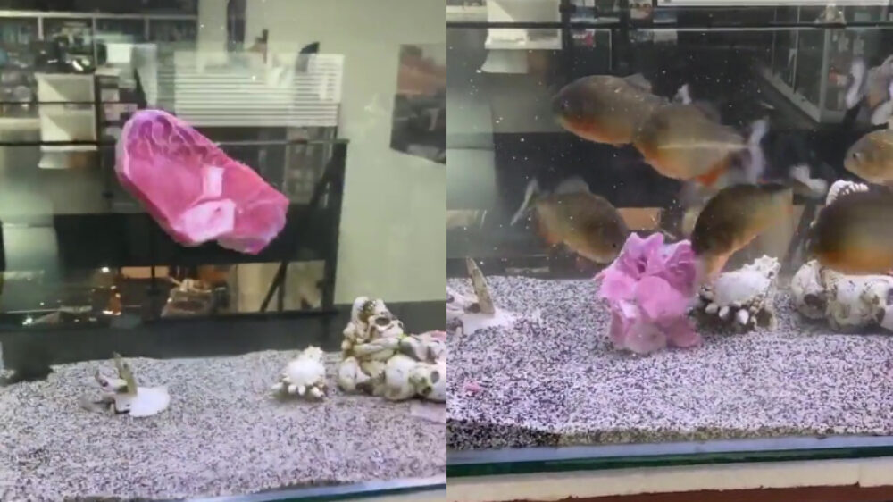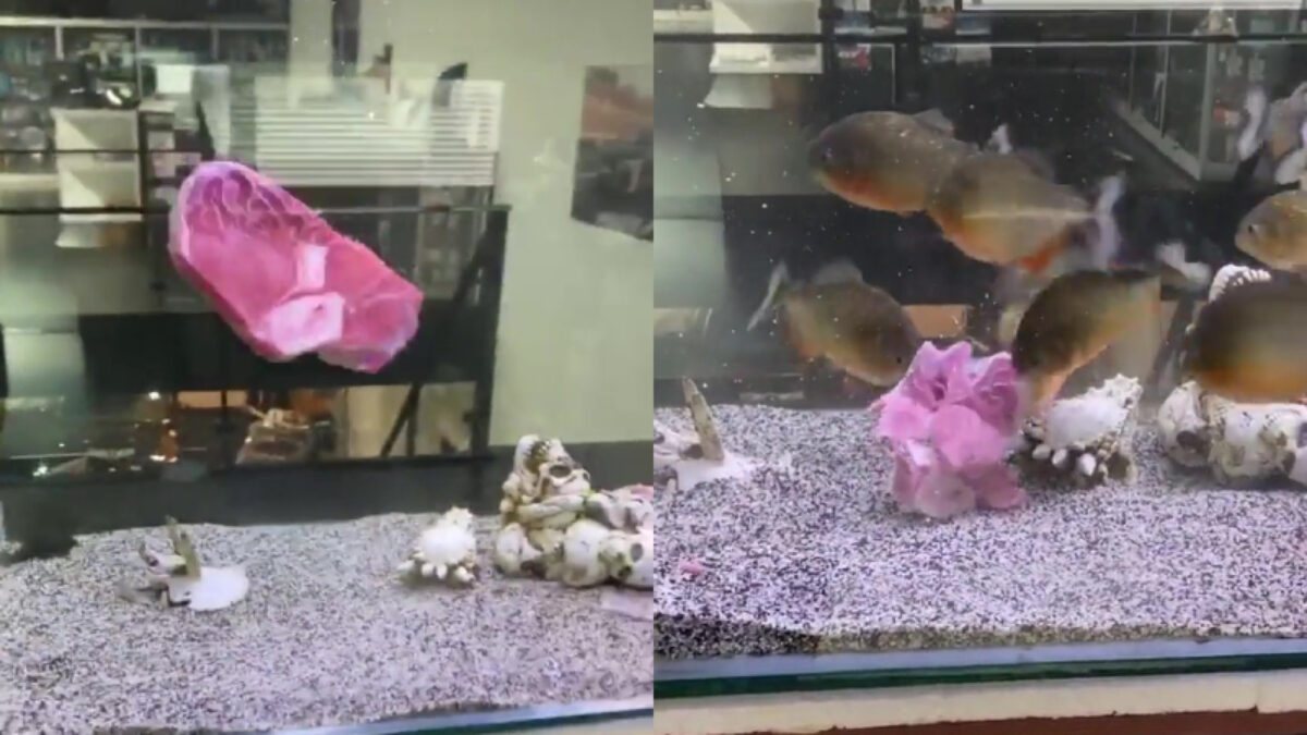 Piranha's staan bekend als vraatzuchtige beestjes die binnen no-time grote stukken vlees zouden kunnen verorberen. Maar is dat ook wel zo? Deze aquarium-eigenaar laat zien hoe snel deze veelvraten een complete steak wegwerken.
