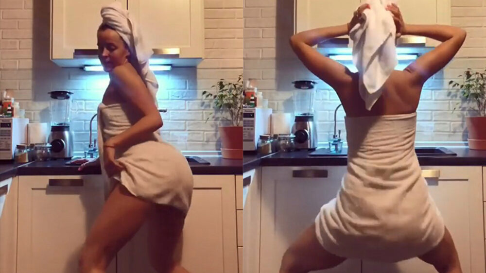 Goedemorgen. Dame geeft een dansje weg na verfrissende ochtenddouche