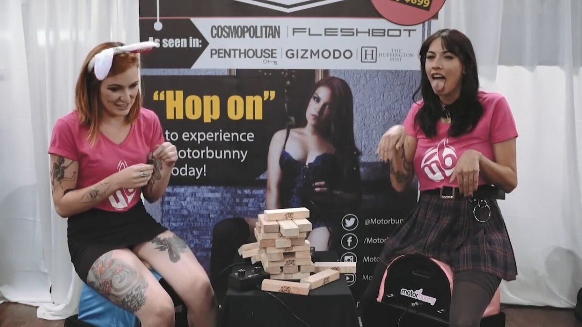 Dames spelen een potje Jenga terwijl ze op een trilstoel zitten Virals
