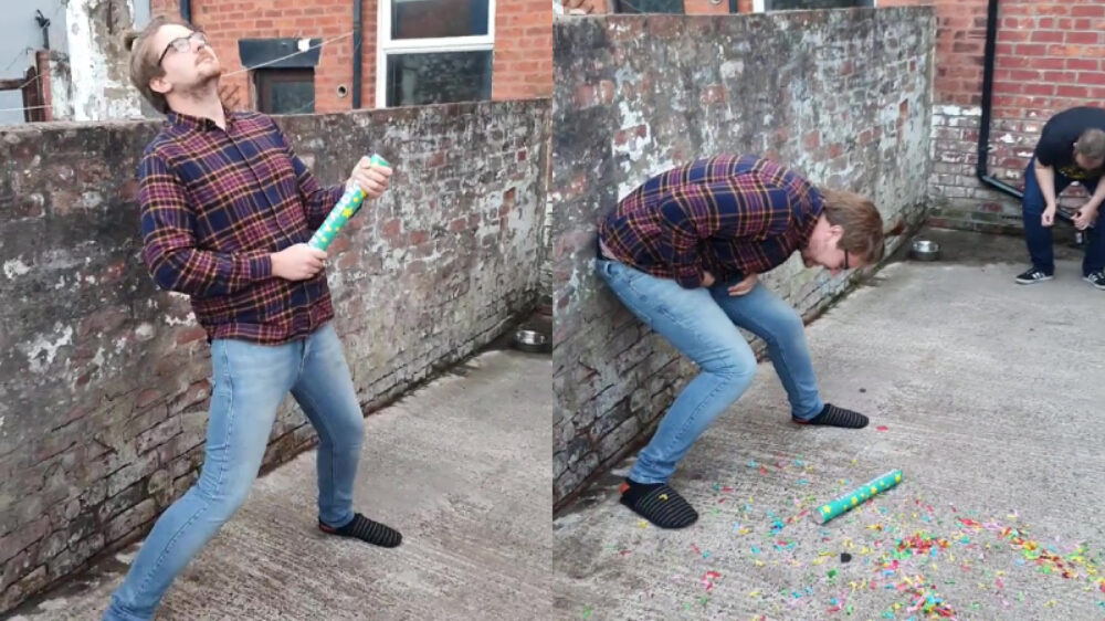 Leuk hoor, zo'n confettikanon, maar zorg er in vredesnaam voor dat je de goede kant boven houdt. Je kruis zal je dankbaar zijn, al vinden we het in dit geval wel enigszins verdiend. Met je halve man-bun.