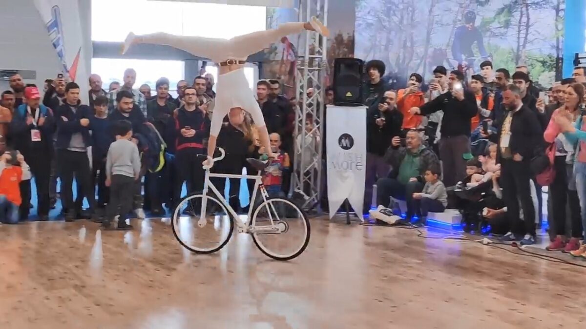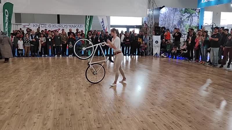 Behendige dame weet op d'r tweewieler de zaal te imponeren met haar fietstrucs
