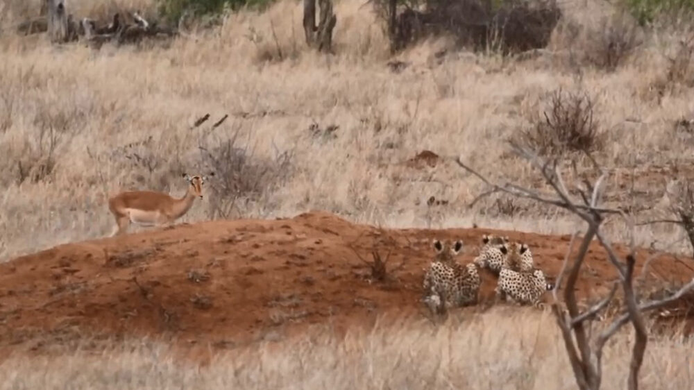 Een nieuwsgierige impala heeft geen idee dat hij richting 3 hongerige jachtluipaarden loopt. Als hij er eenmaal achterkomt is het eigenlijk al te laat en na een achtervolging van ongeveer 100 meter is het tijd om te genieten van de afhaalmaaltijd.