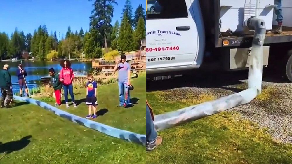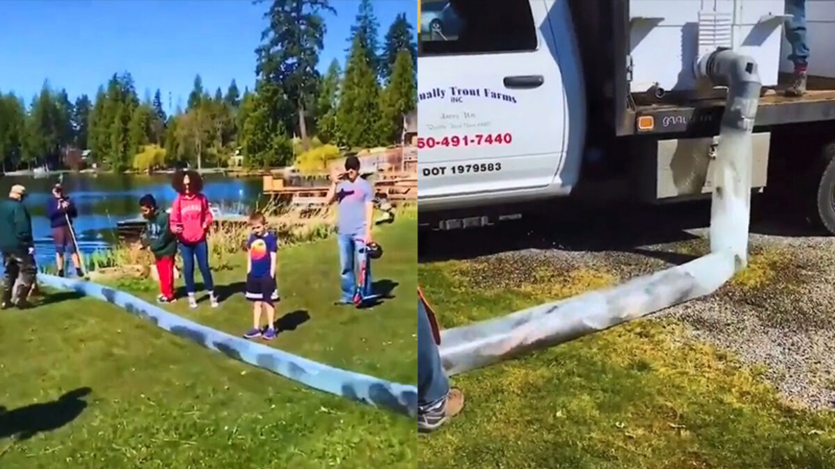 In kunstmatige meren moeten uiteindelijk ook vissen rondzwemmen, maar we stonden er niet eerder bij stil dat het op deze manier gaat. Als je de video andersom afspeelt wordt vissen ineens wel heel gemakkelijk.