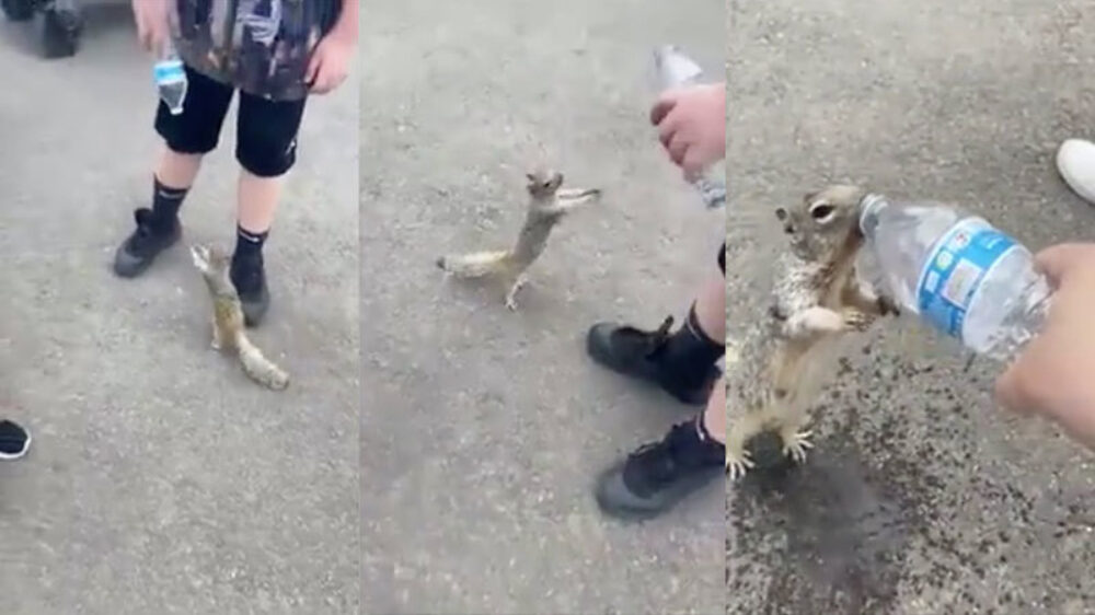 Het is tijd voor een soort van feelgood-video, want er is al genoeg narigheid in de wereld. Gewoon even een dorstige eekhoorn een flesje water aan zijn bek zetten, mooi.