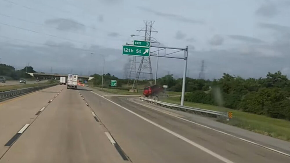 Deze Toyota RAV4 verliest op de linkerbaan plotseling de macht over het stuur en vliegt net als The Dukes of Hazzard door de lucht. Helaas voor de bestuurder wel via de vangrail tegen een lantaarnpaal, maar het zag er toch indrukwekkend uit.
