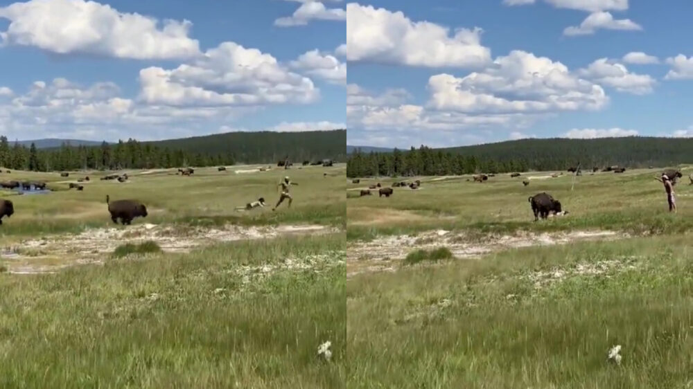 Lieten we gisteren nog zien dat je tijdens het wandelen op moet passen voor nieuwsgierige beren, vandaag blijkt dat je ook met bizons uit moet kijken. Deze dame mag blij zijn dat ze deze wandeling na kan vertellen.