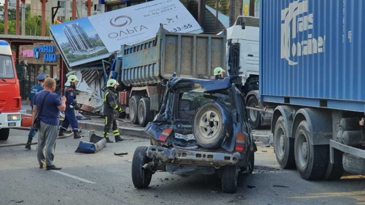Russische chauffeur verliest controle over zijn kiepwagen en ramt auto's en gebouw