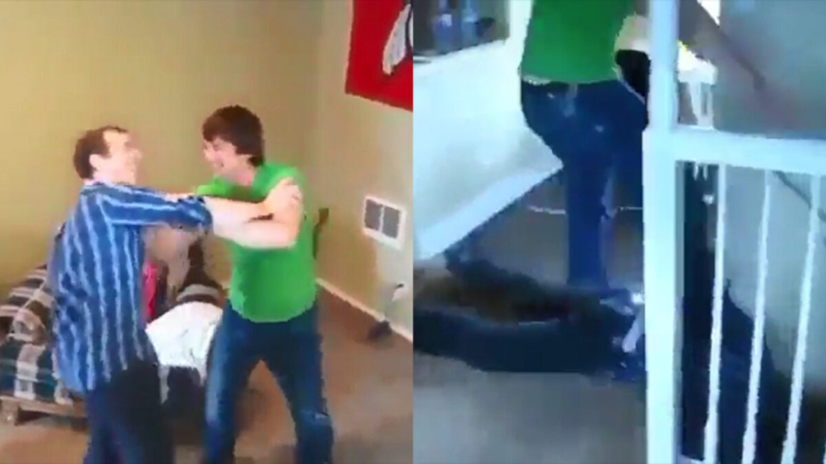 Kerel gebruikt zijn mattie als surfplank tijdens robbertje stoeien