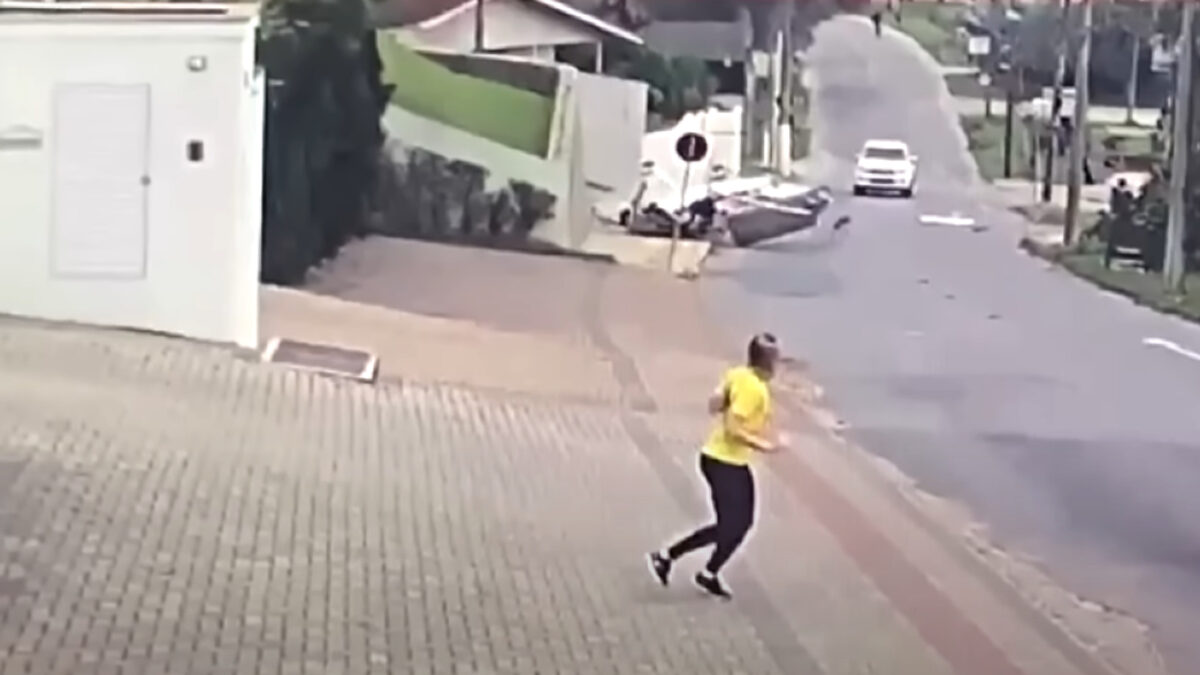 Als je een stukje gaat hardlopen verwacht je een heleboel, maar niet dat er net achter je een vliegtuig uit de lucht komt vallen. Dit gebeurde echter wel in het Braziliaanse stadje Guabiruba. De twee inzittenden kwamen er wonderwel met wat gebroken ribben en wat schaafwonden vanaf.
