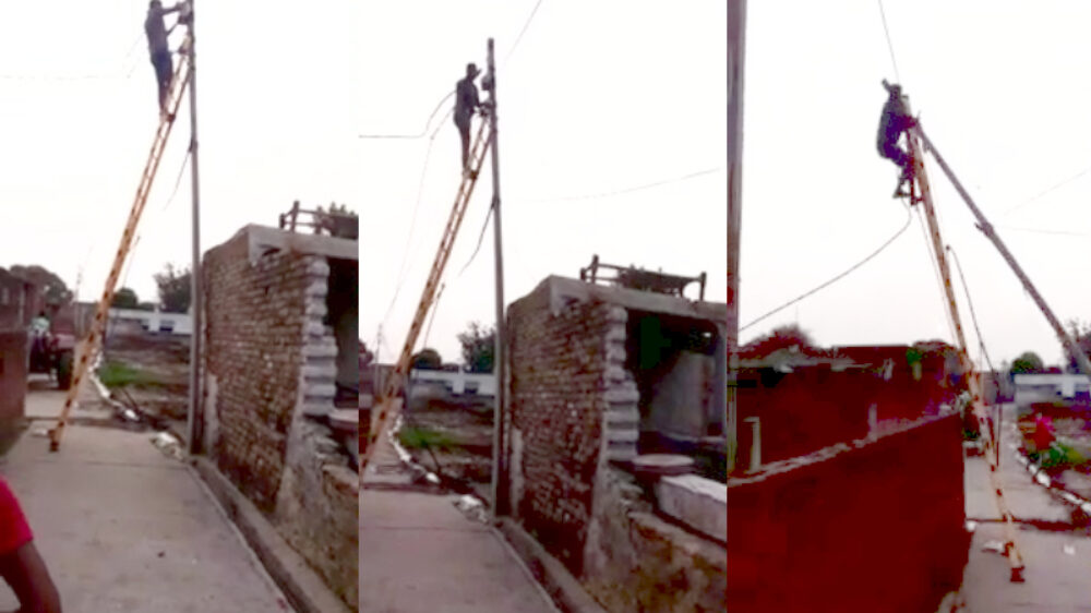 Met een ladder bovenin een elektriciteitspaal gaan staan klussen is in sommige landen niet heel veilig. Ligt soms niet eens aan de stroomvoorziening, maar in het geval van India aan de algehele stevigheid van de paal.