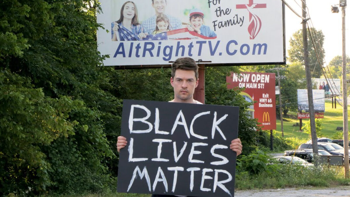Protesteren voor het goede doel is één ding. Met een Black Lives Matter-bord bij het hoofdkwartier van de KKK in Harrison, Arkansas (Amerika) gaan staan is een tweede. Deze lefgozer deed dat laatste en had niet echt een heel leuke dag. Understatement.