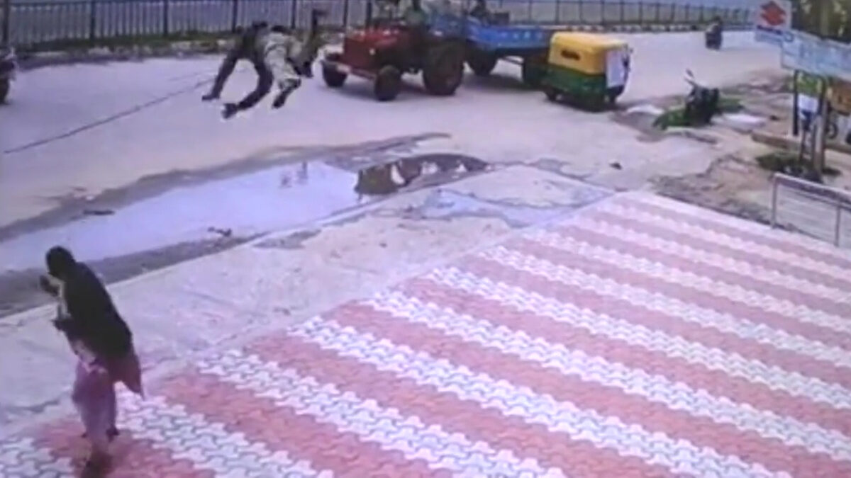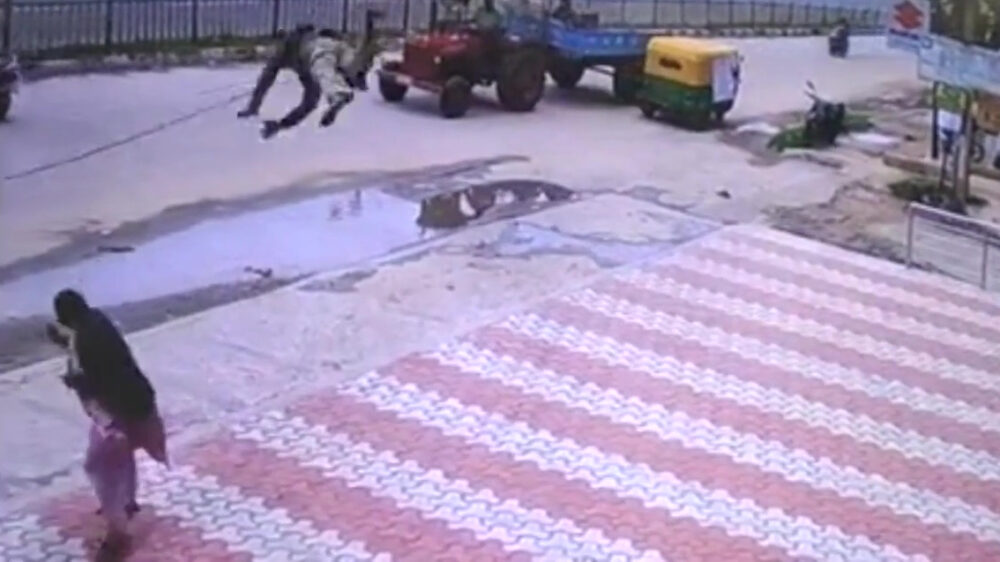 Dat vrouwelijke wandelaars regelmatig kerels in hun nek hebben hijgen is bekend, maar zo letterlijk als hier zien we dat niet vaak. De man stond bovenop een kabel die (waarschijnlijk door het verkeer) ineens werd strakgetrokken en hij onvrijwillig een stuk ging vliegen.