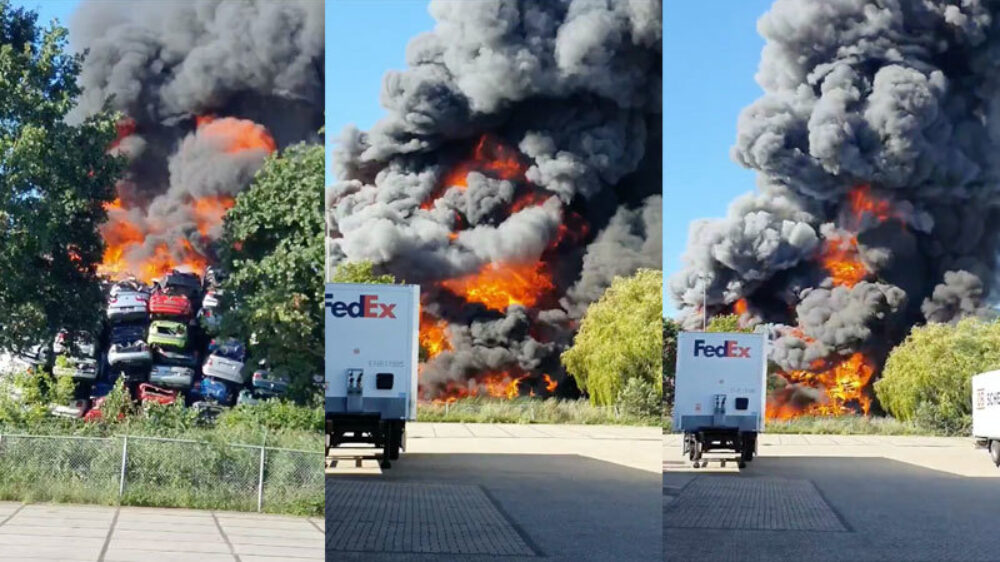 NL-Alert: metershoge vlammen bij autosloperij in Duiven