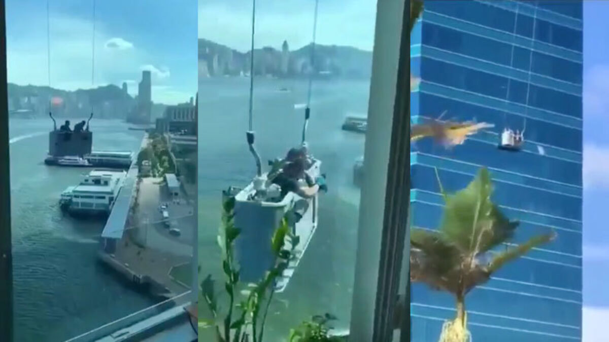 Chinese glazenwassers worden door de wind van links naar rechts geslingerd