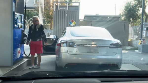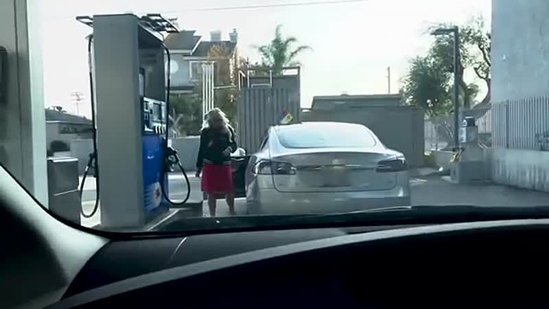 Niet zo snugger blondje is hard op zoek naar de benzinedop van haar Tesla