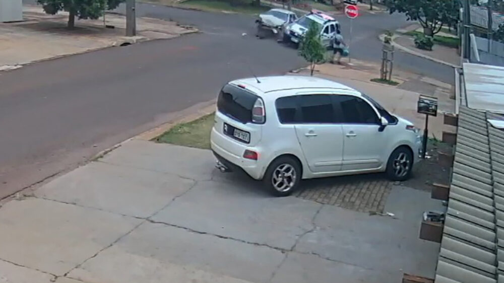 Dankzij een prima reactie zorgt deze Braziliaanse voetganger er uiteindelijk zelf voor dat ze niet onder een politiewagen belandt. Misschien met een klein beetje hulp van het stopbord, maar dat soort geluk dwing je af.