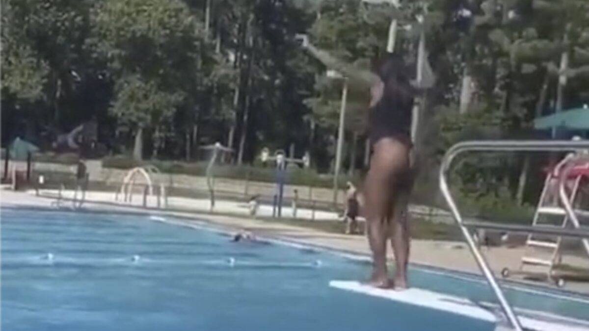 Dame verliest niet alleen haar waardigheid op de duikplank