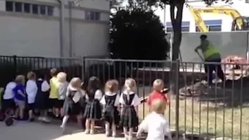 Bob de Bouwer heeft geen haast en werkt op zijn dooie gemakje verder. Misschien krijgt hij wel wat arbeidsvitaminen als een groepje schoolkinderen hem komt aanmoedigen? Mooi.