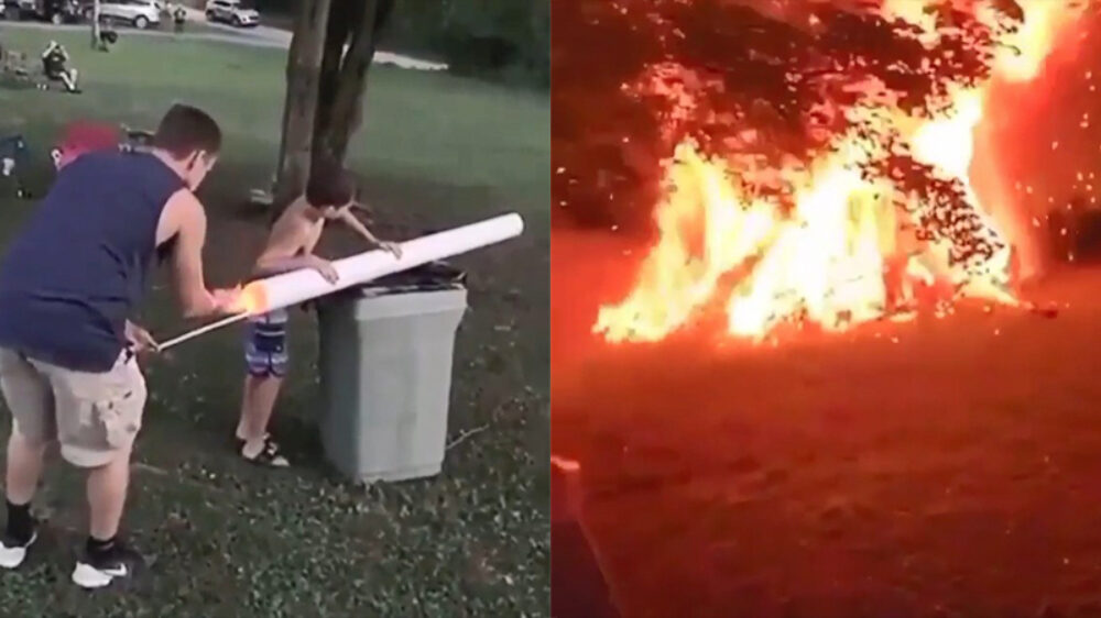 Vreugdevuur met een vuurpijl aansteken zorgt voor zonne grote vuurbal
