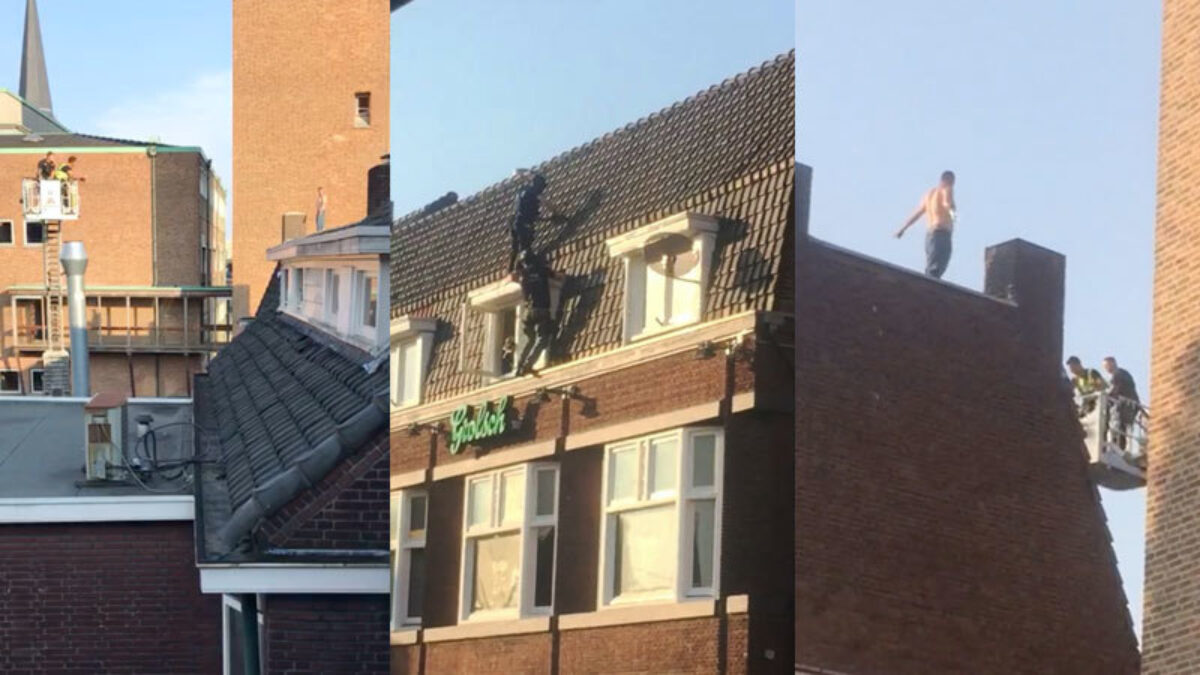 Een verwarde man is gistermiddag op het dak van een eetcafé in Hengelo (O) geklommen. Volgens ooggetuigen is deze Duits sprekende man via het fietsenrek op het dak geklommen en vervolgens van dakkapel naar dakkapel geklauterd. Ondanks verwoede pogingen van de brandweer hebben zij hem niet 'naar beneden kunnen praten'.
