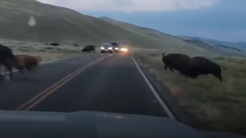 Bizon is helemaal klaar met soortgenoot die het verkeer ophoudt Dieren
