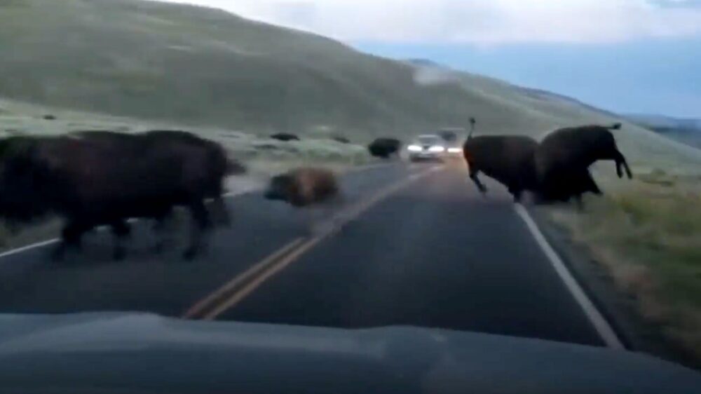 Bizon is helemaal klaar met soortgenoot die het verkeer ophoudt
