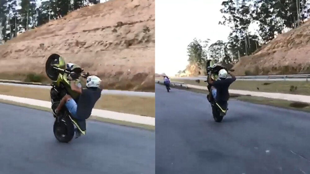 Motorbink vergeet vooruit te kijken als hij er een wheelie uit gooit