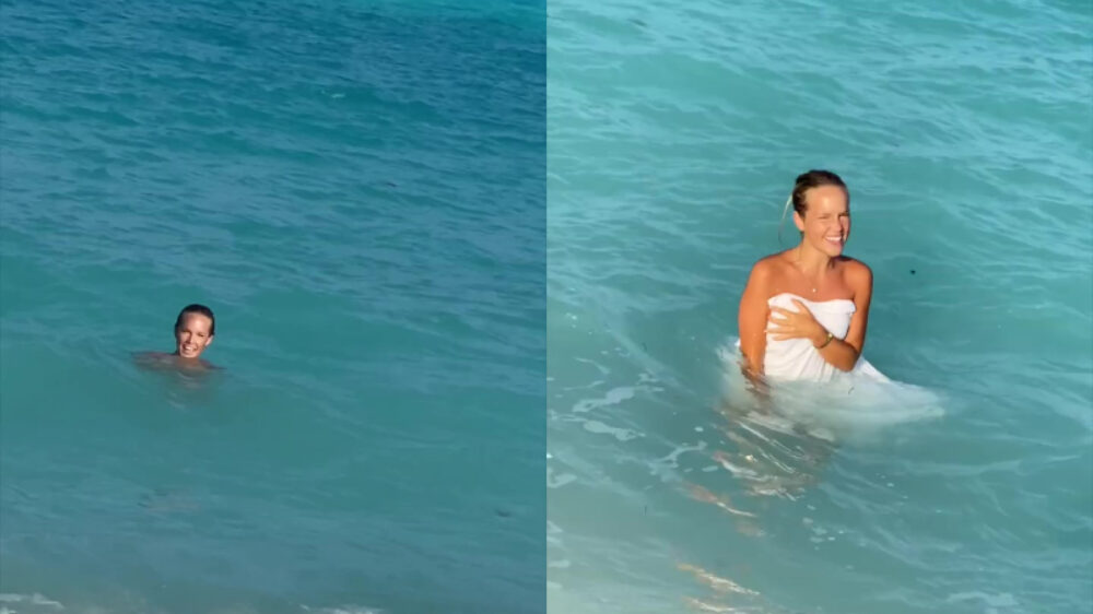 Je vriendin een in water oplosbare bikini geven levert heerlijke beelden op