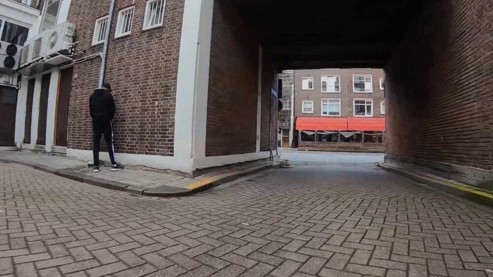 Op dinsdag 25 augustus omstreeks 17.15 uur vertrek ik van het parkeerterrein Kortebrantstraat te Rotterdam. Bij het uitrijden zie ik een kerel tegen een huis aan pissen en toeter 1x.