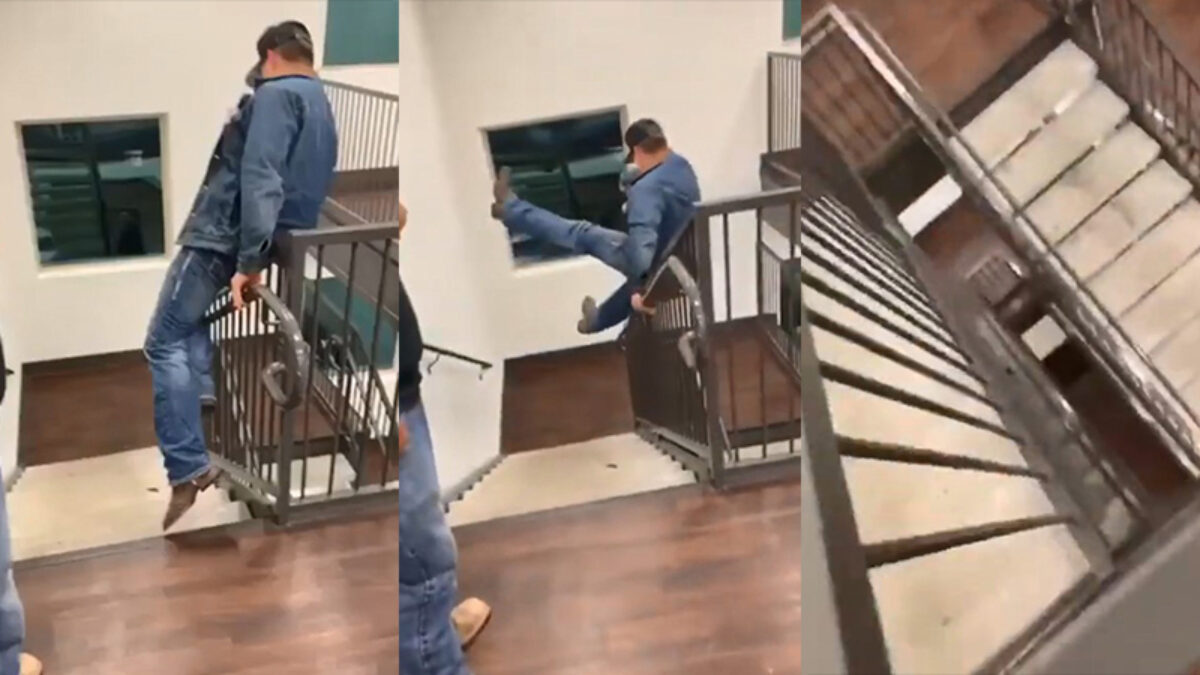 Hij mag nog van geluk spreken dat ie niet helemaal naar beneden klettert, want dan was het zeker de laatste keer geweest dat hij de trap neemt...