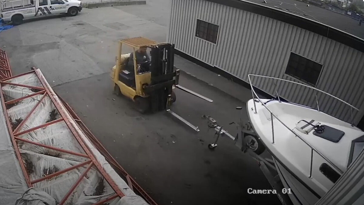 Het zit deze vorkheftruckchauffeur niet écht mee tijdens het stallen van een bootje